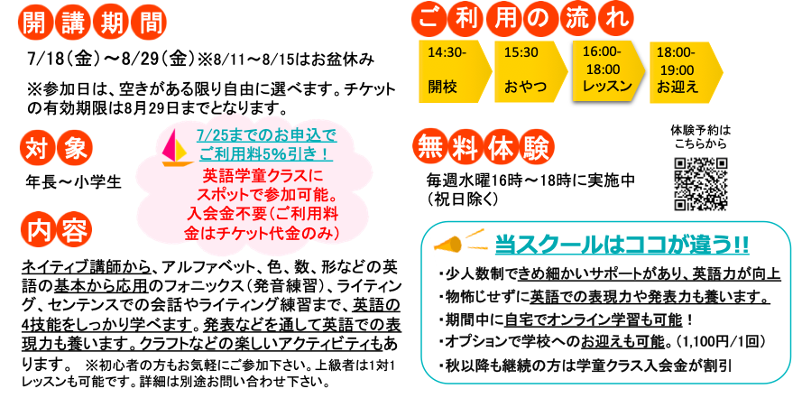 ③お子さんは、水曜 16:00〜18:00)に英語学童クラスの無料体験にご参加頂けます。体験予約は前日正午までにこちらからお願いします。夏休み前の体験も可能です。