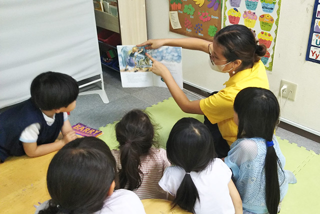 ネイティブ講師のサポートを受けながら、一緒に絵本を読んだり、自分が書いた文章を読んだりします。